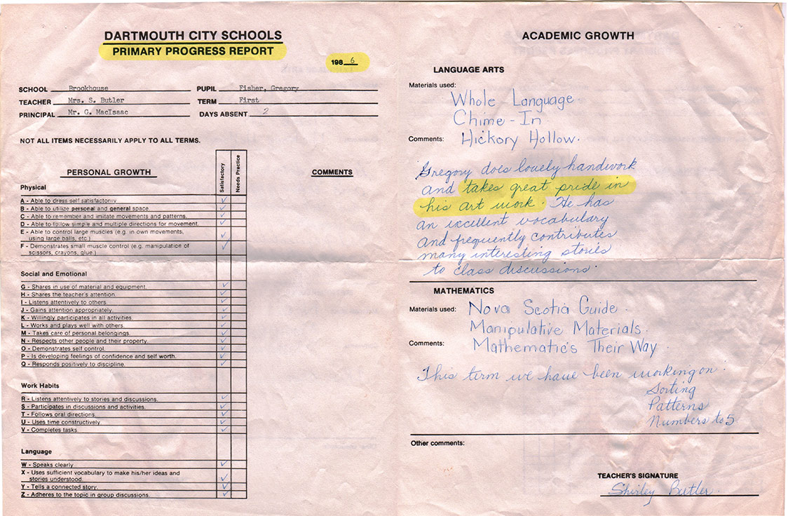 my report card from 1st grade noting how much pride I take in my artwork.
